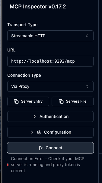 To test that our MCP server is running and properly secured, we can use the MCP Inspector.