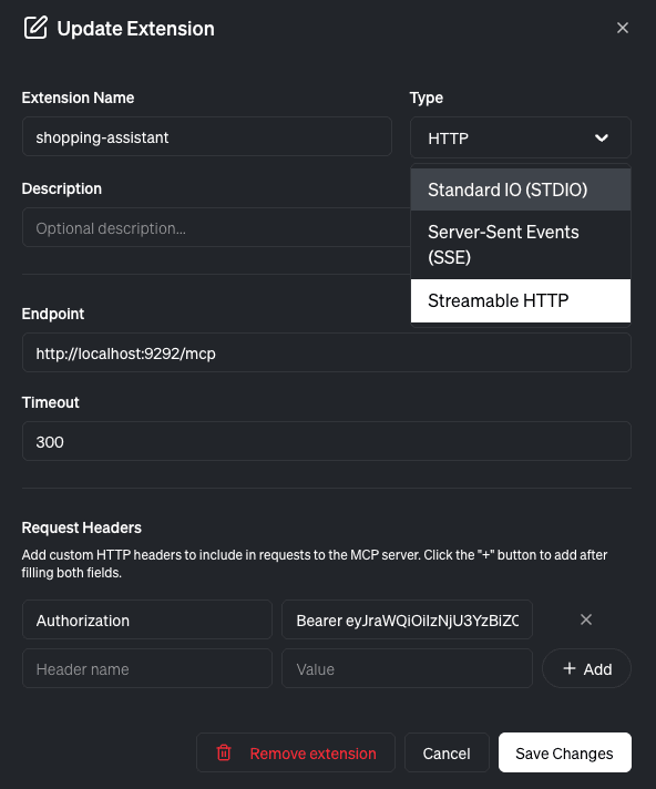 We provide Goose with our generated token and the MCP endpoint so it can securely connect to the server. Once connected, we can query the available tools.