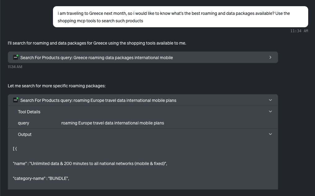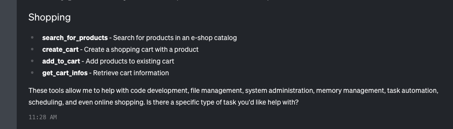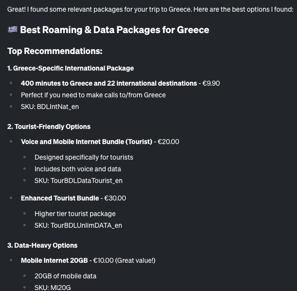 The assistant demonstrates awareness of our internal data and responds accurately. It can invoke the tools we defined, like querying the product catalog.