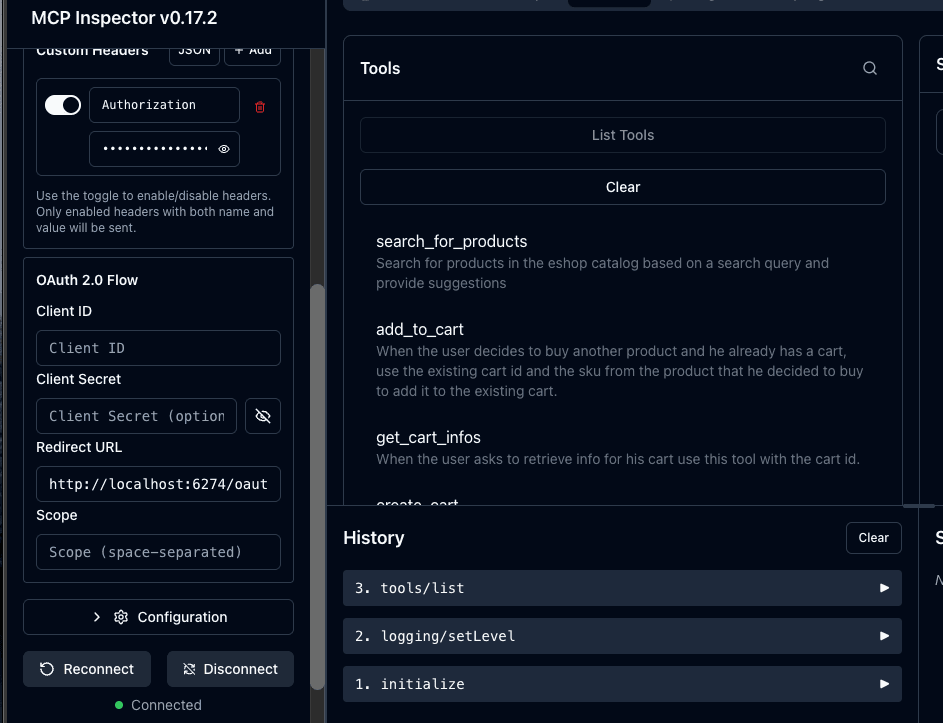 This time the connection succeeds, confirming that the MCP server is secured and we can now view the tools we have defined.
