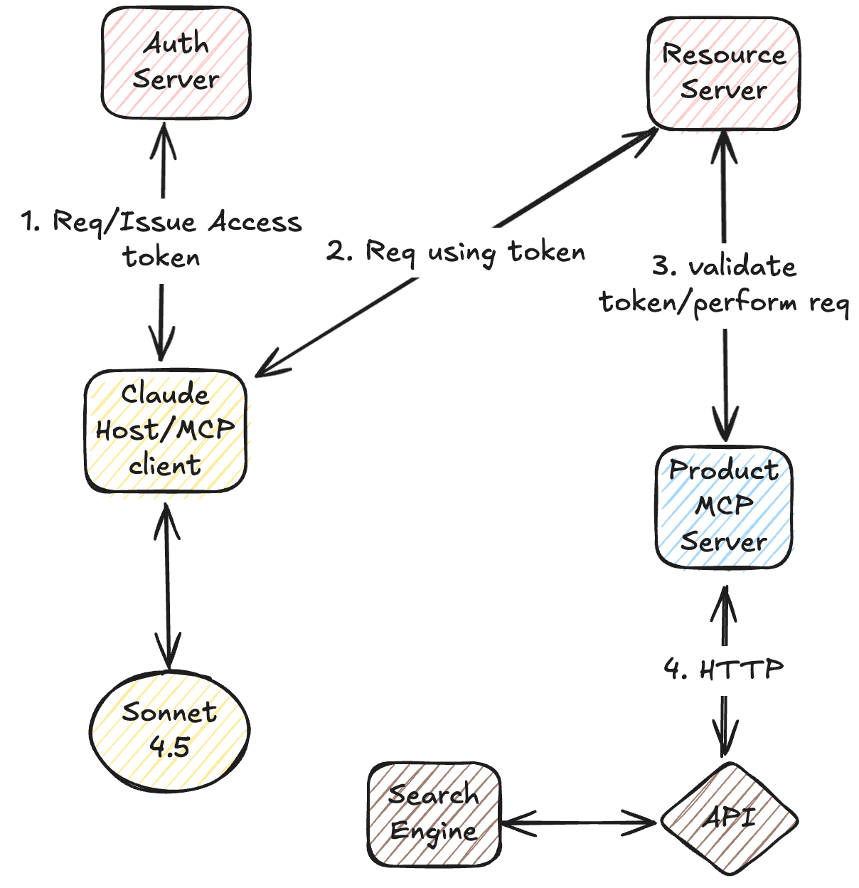In this example, we’ll build an e-shop assistant that can safely access internal data in real time, use it to generate context-aware responses, and even perform actions on behalf of the user. The MCP server will be implemented with Spring Boot and Spring AI, and secured using Spring Authorization Server together with Spring resource server capabilities. Claude, running SONNET 4.x, will act as the Host/MCP client—but you could also build your own host or client in Spring Boot with any model you prefer. The diagram below illustrates the high-level architecture. [4]